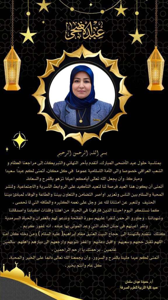 عميد كلية التربية للعلوم الصرفة تهنئ بمناسبة حلول عيد الاضحى المبارك