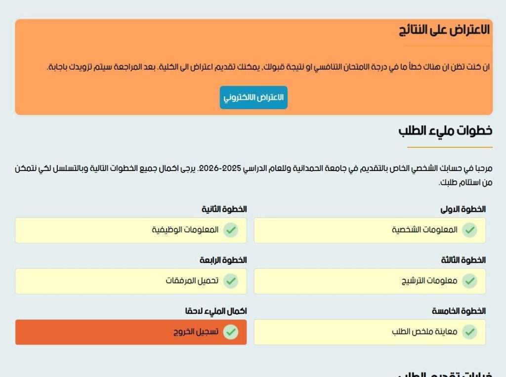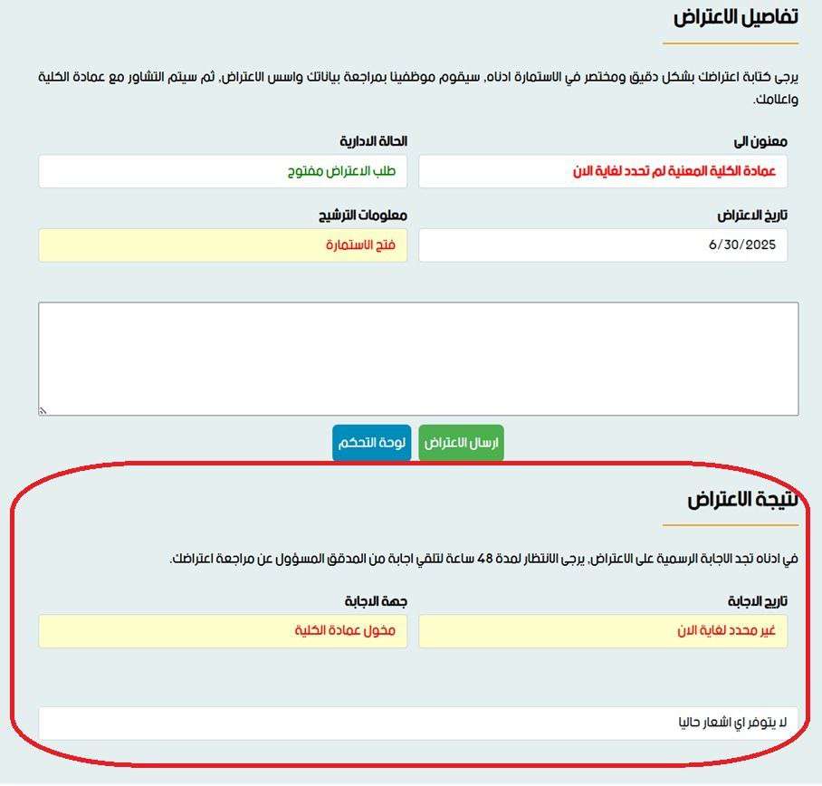 فيما يلي الواجهة الإلكترونية المُفعّلة لتقديم الاعتراضات بأنواعها: (نتيجة الامتحان، نتيجة القبول، نتيجة التدوير).