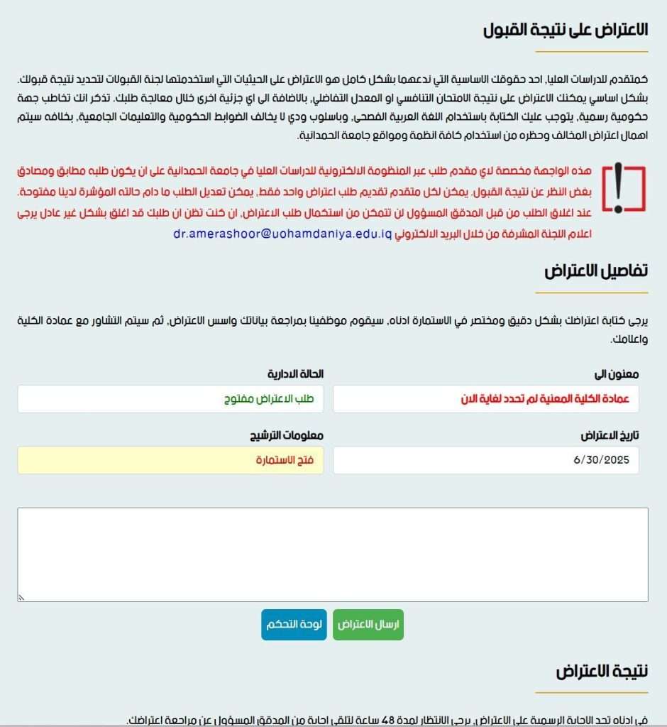 الصورة الثانية تبيّن واجهة تقديم الطلب، حيث يمكن للمتقدم كتابة مضمون الاعتراض ثم الضغط على الزر ذي اللون الأخضر لإرسال الطلب مباشرة إلى عمادة الكلية.